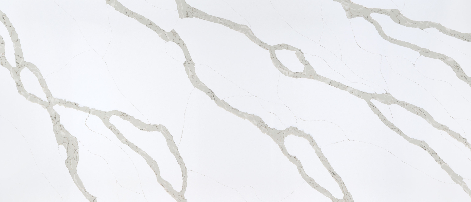 Daring, elegant, and expressive, Calacatta Bali Quartz Countertops feature a warm white background with a striking mix of bold, dramatic veins intertwined with thin veins for a natural effect.