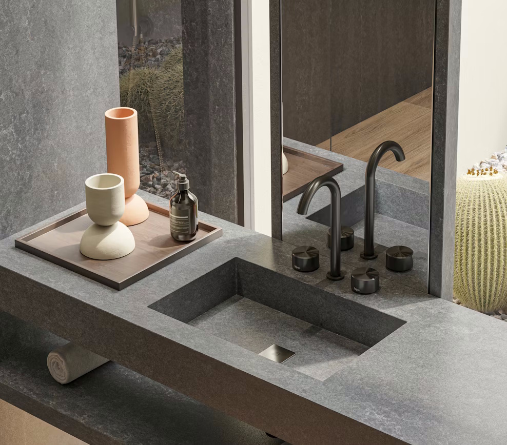 A serene and natural concrete canvas with subtle copper touches intertwined with nebulous veins that add a sense of fluidity.