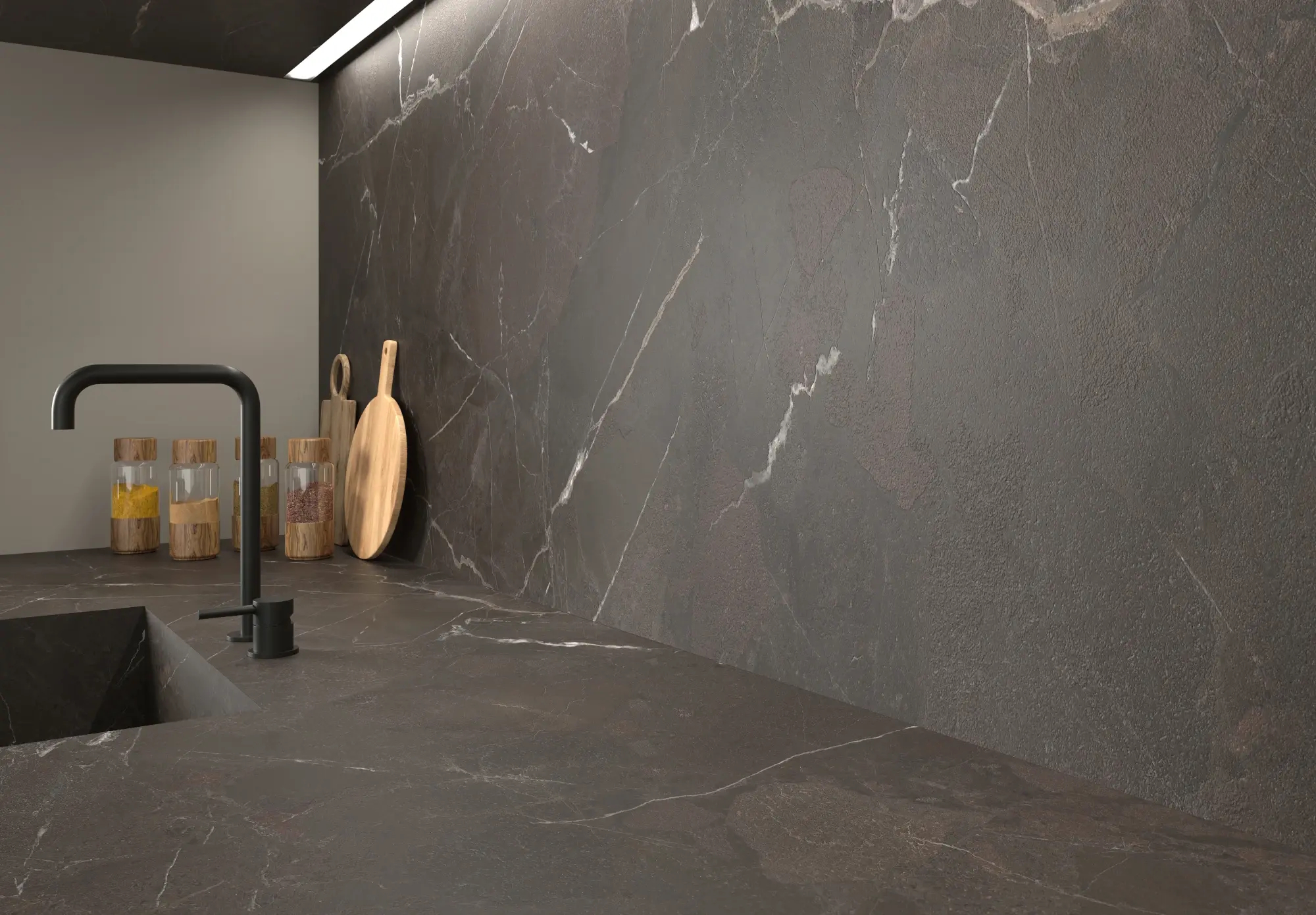 This dark-toned design expresses the solemnity and sobriety of quartzite, exalting the innate elegance of nature. Its black background intermixed with coppery tones on which subtle white and greyish veins stand out, gives Breccia Imperiale a unique and majestic personality.