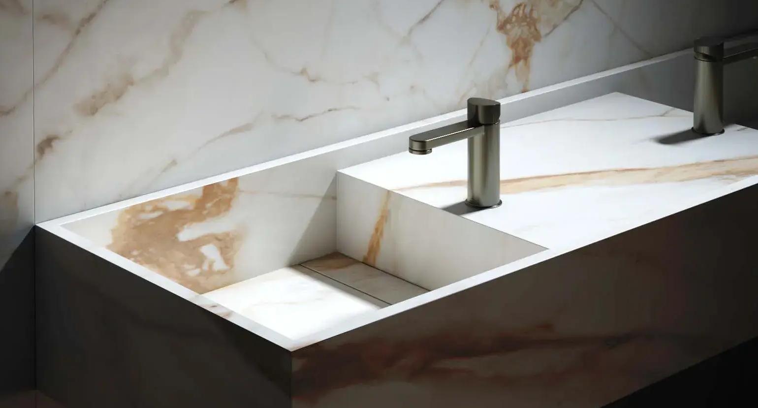 The character and the elegance of the classic white marble are materialized in an elegant surface characterized by its luminous veins with outstanding golden details. The possibility of projecting an endless horizontal and vertical continuity creates an exceptional infinite pattern.