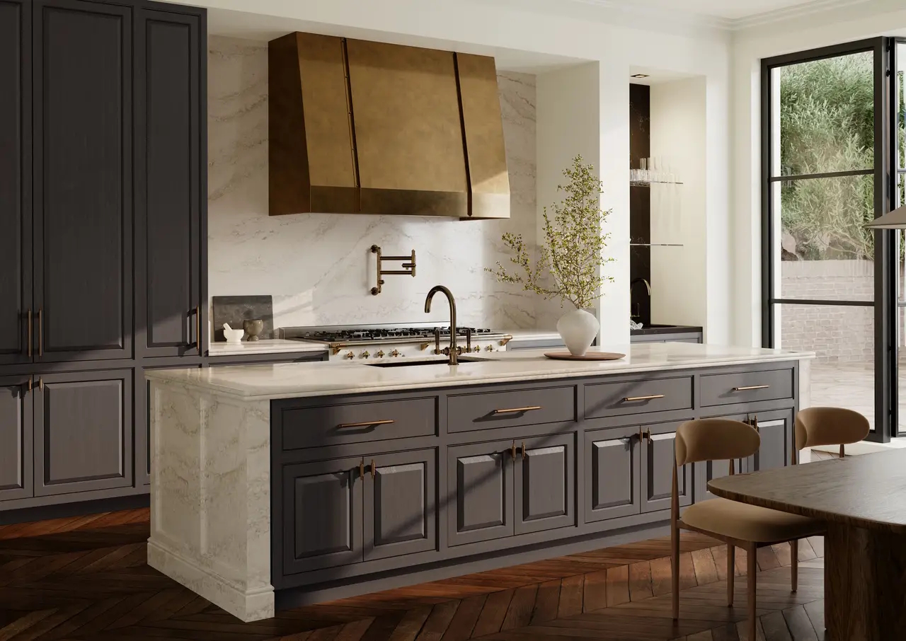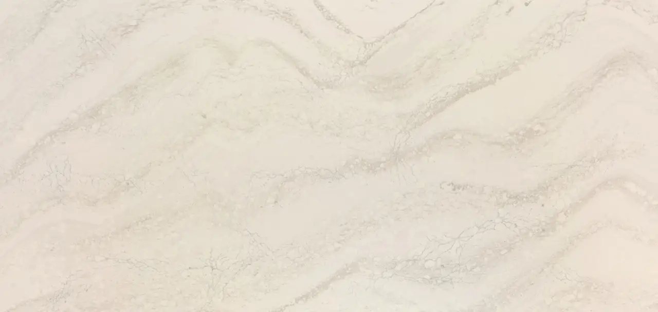 Marbled and soft taupe cascades across a lustrous, alabaster-hued background featuring honey accents, cool charcoal gray veins, and delicate ebony flecks for unparalleled depth.